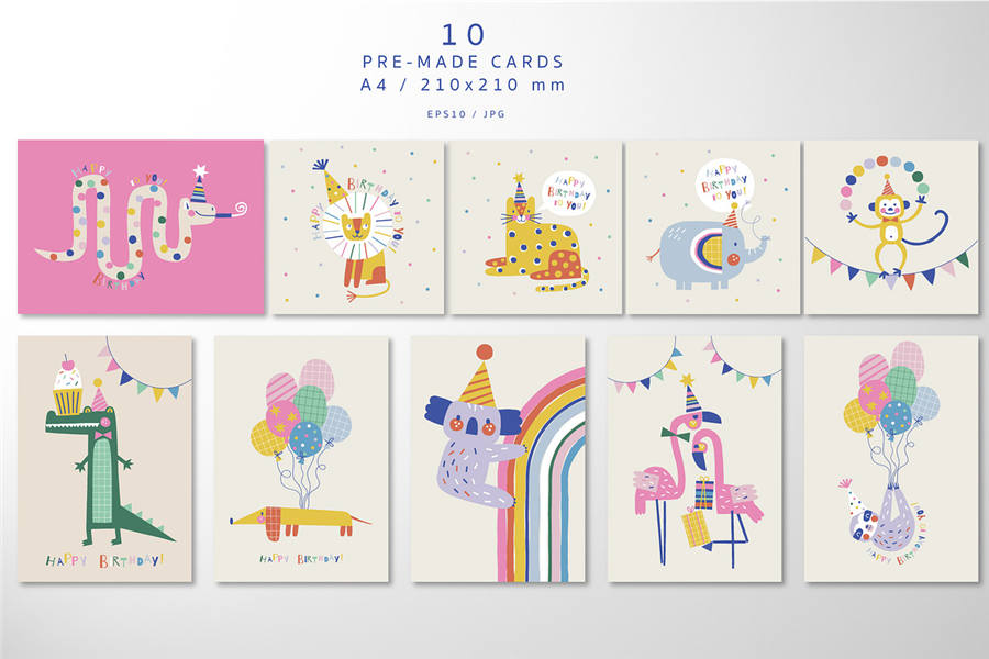 10 张预制卡片(尺寸 A4 / 210 x 210 毫米)有以下几种: