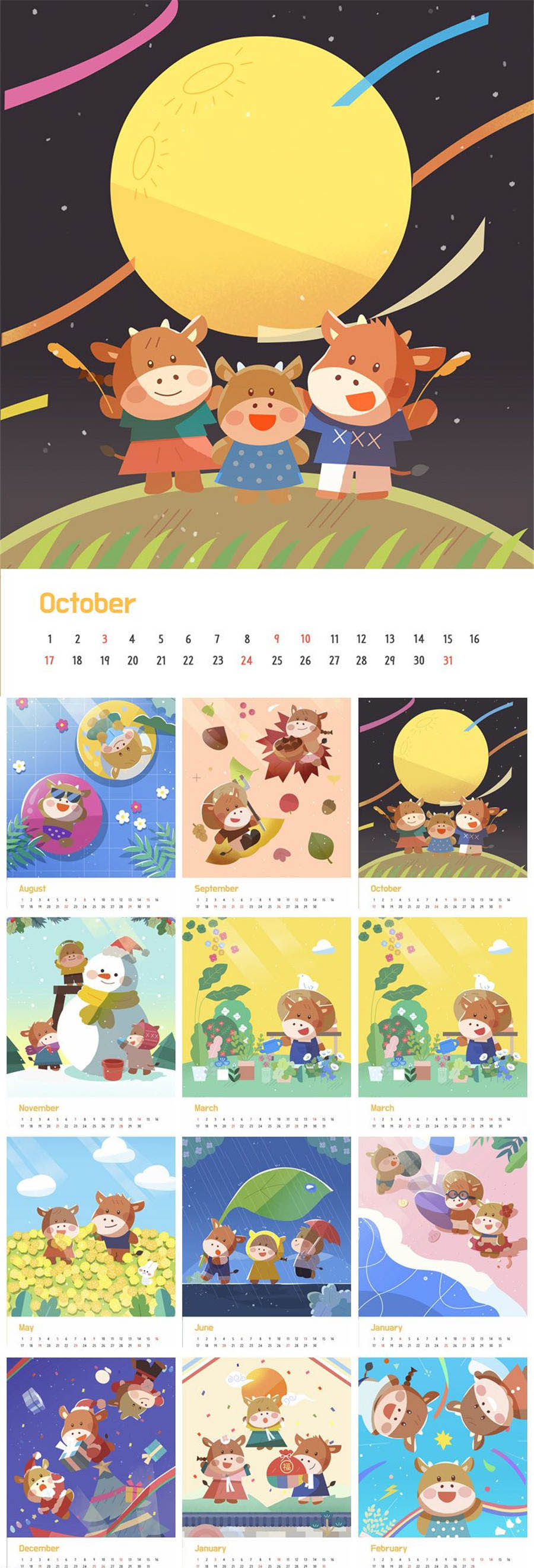 12款牛年辛丑年卡通日历台历挂历背景PSD素材