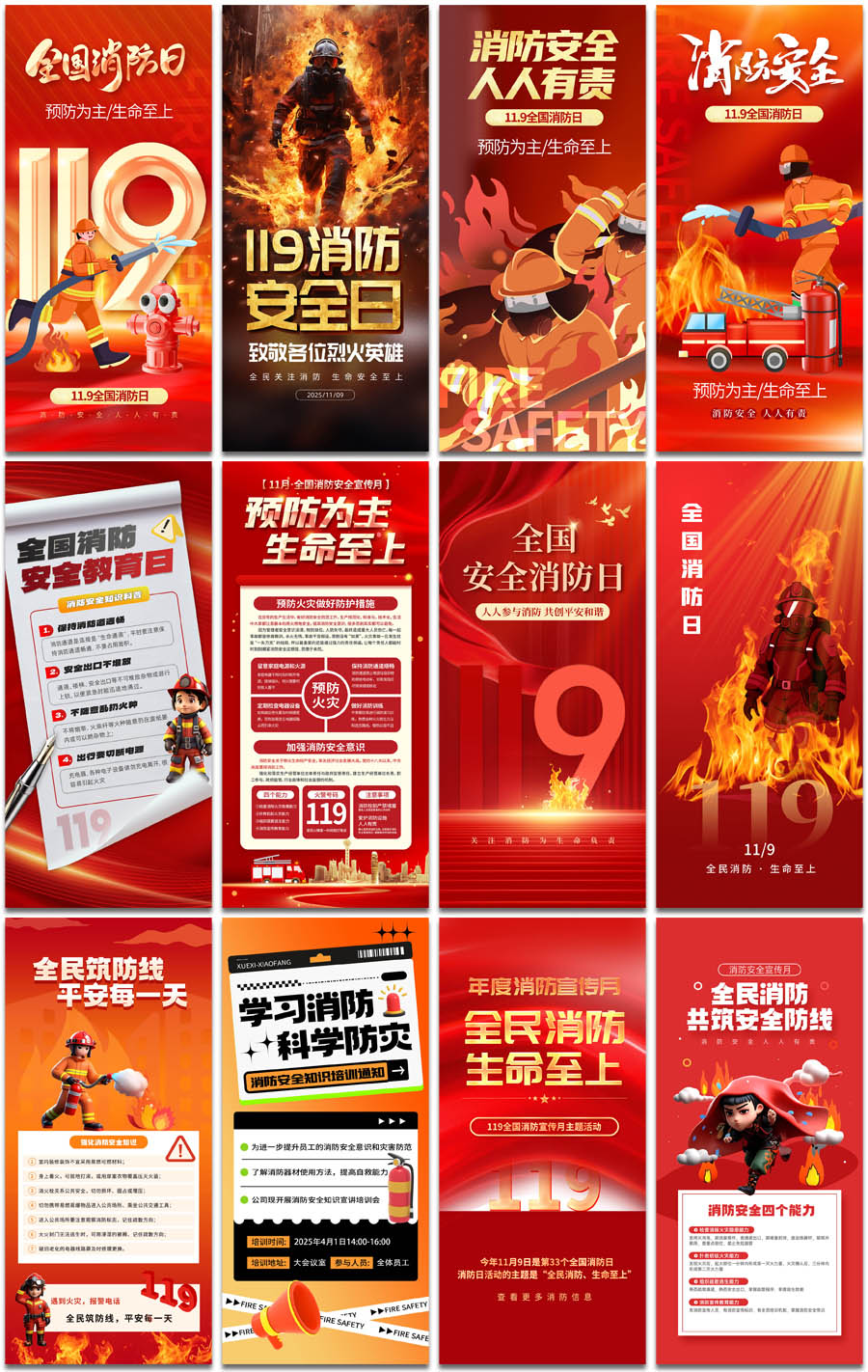 消防安全宣传教育日119烈火英雄消防知识PSD海报设计元素材模板