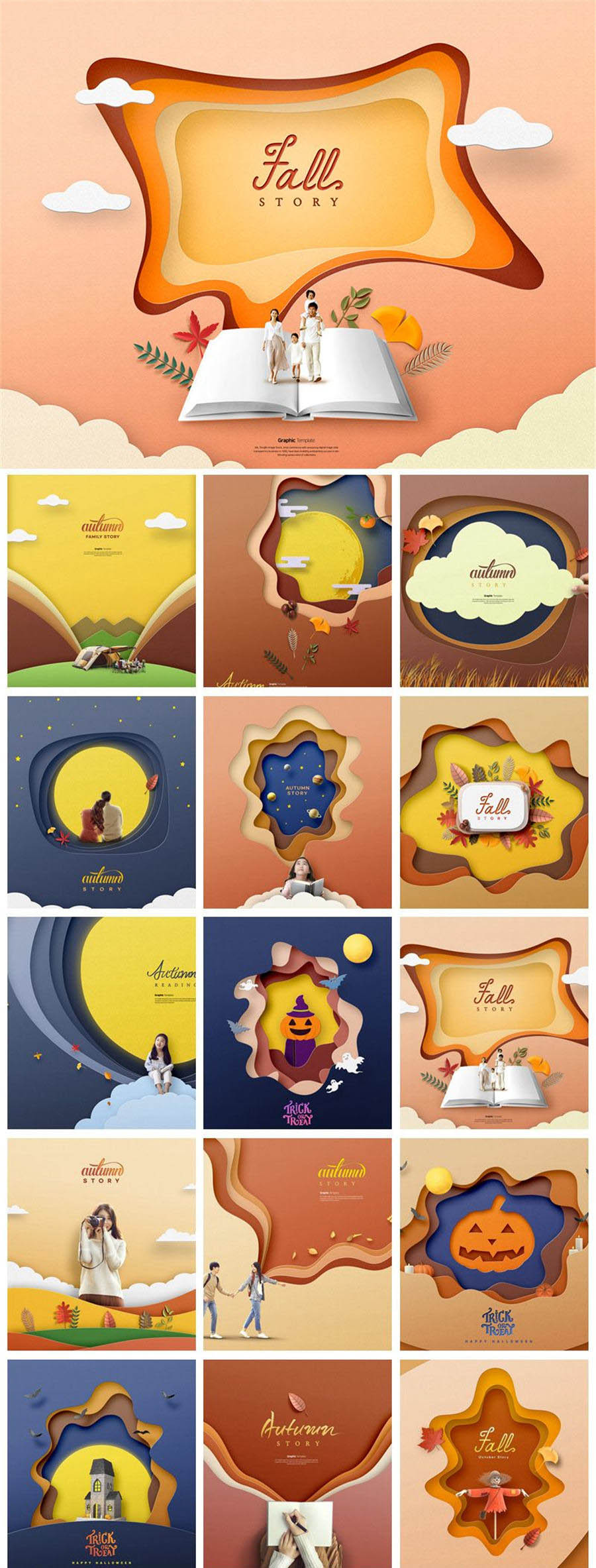 剪纸风格秋天秋季秋日万圣节插图画创意元素海报PSD模板素材设计