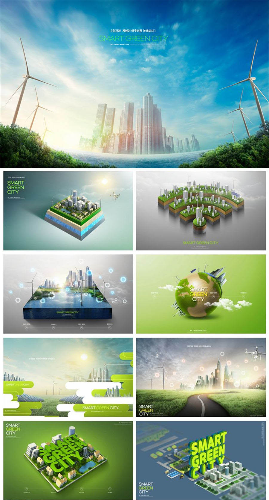 绿色环保城市新能源立体场景合成PSD创意元素海报模板素材设计