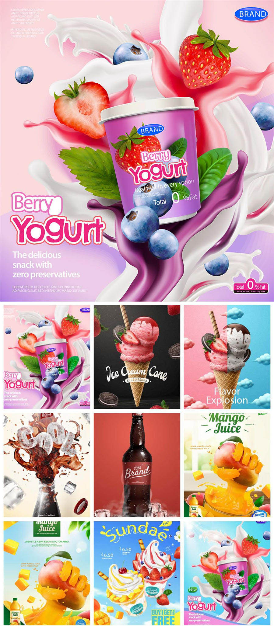 水果蓝莓酸奶昔芒果汁饮料冰淇淋可乐创意AI元素海报模板素材设计