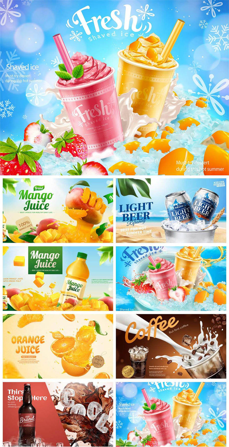 水果饮料果汁冰淇淋冷饮沙冰可乐汽水创意元素AI海报模板素材设计