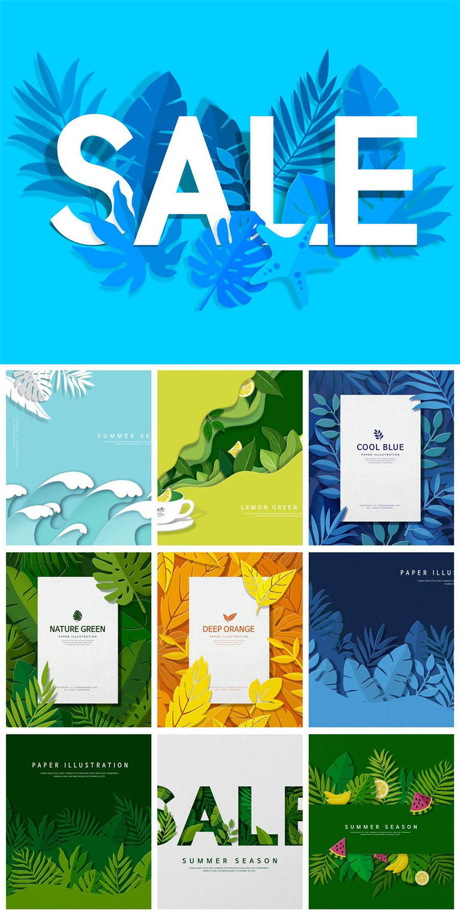 剪纸风格树叶森林热带植物海浪花丛创意元素PSD海报模板素材设计