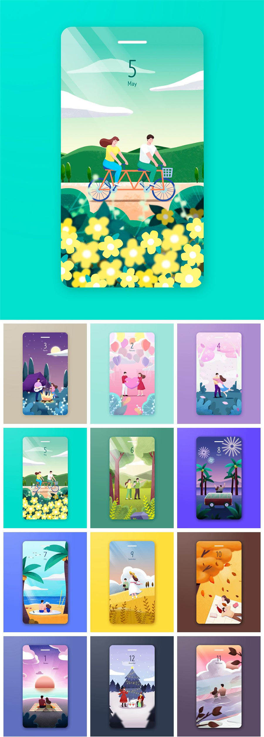 卡通情侣旅游旅行踏青风景独家插图画创意元素海报PSD模板素材设计