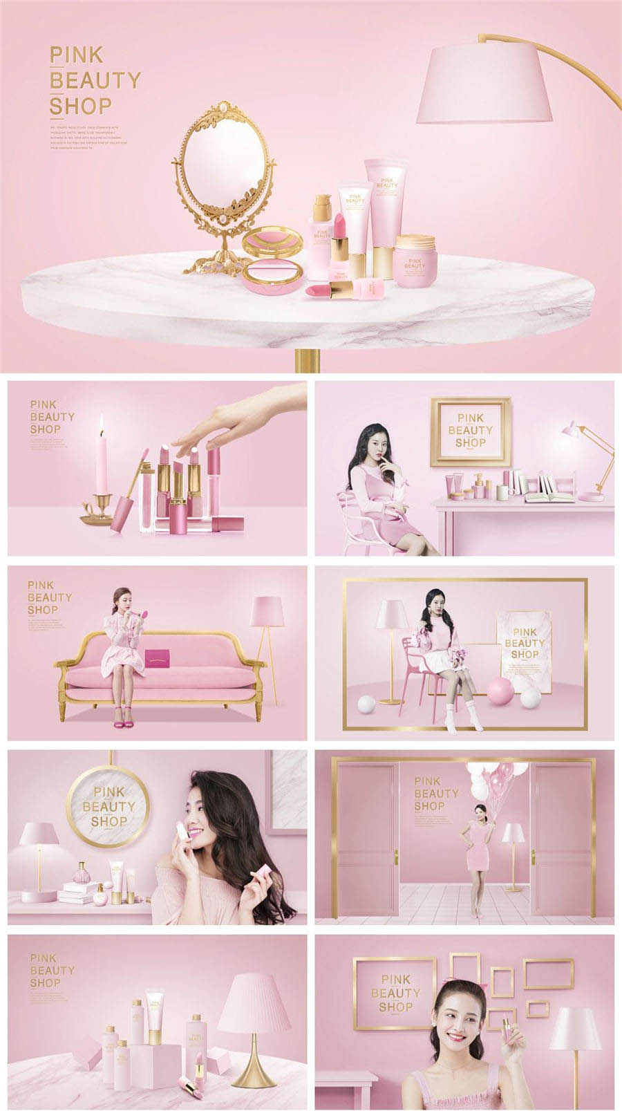 女性美妆直播间粉色保养护肤化妆品创意元素海报模板PSD素材设计