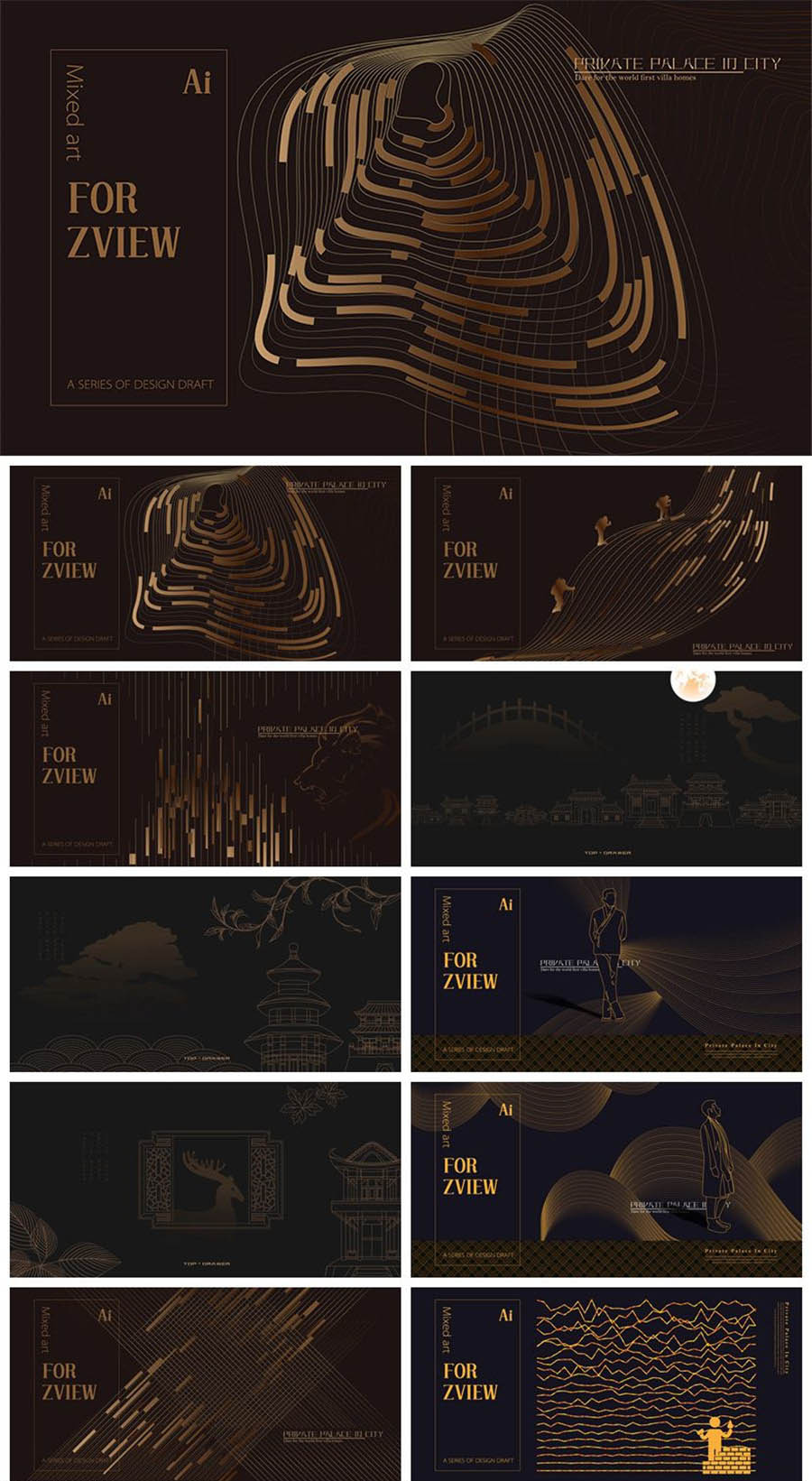 10款金色抽象线条房地产主视觉KV海报展板背景AI素材