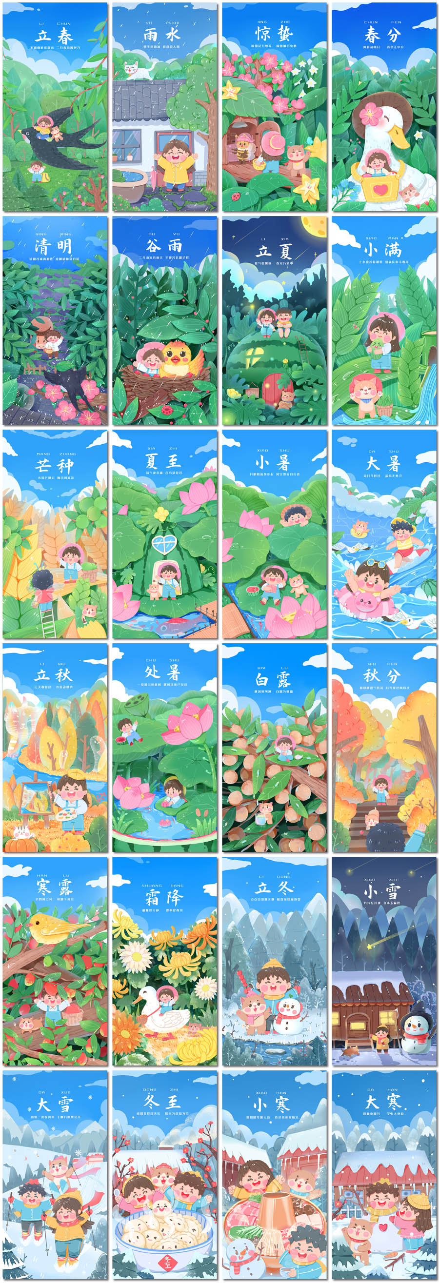 二十四节气春夏秋冬儿童插画图森林24节气PSD海报设计元素材模板