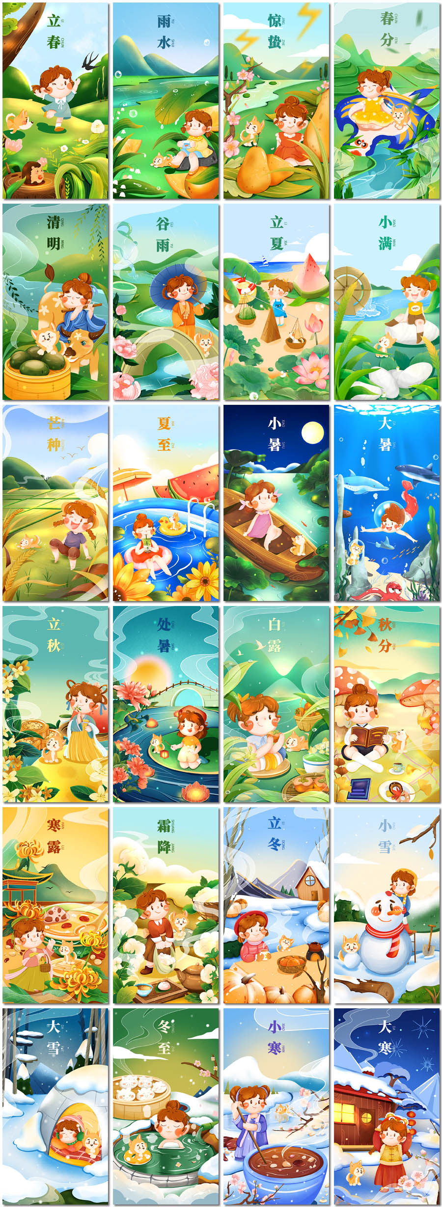 二十四24节气传统习俗四季儿童插图插画PSD海报设计元素材模板