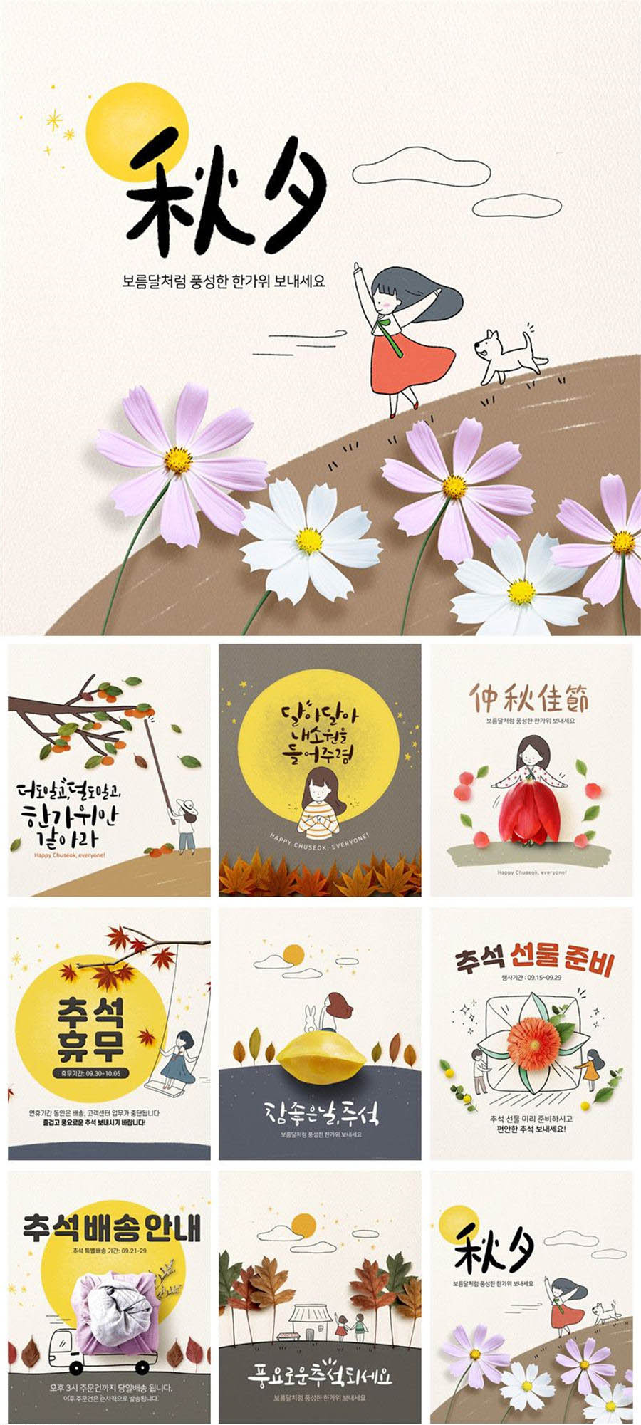 秋天秋季花朵花卉枫叶手绘卡通插画创意元素PSD海报模板素材设计