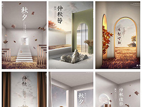 中式景观国风房地产山水建筑中秋节创意元素海报模板PSD素材设计