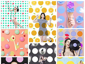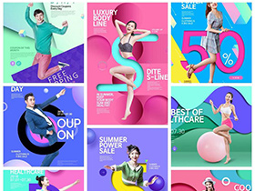 炫彩孟菲斯集合渐变人物模特背景创意元素PSD海报模板素材设计