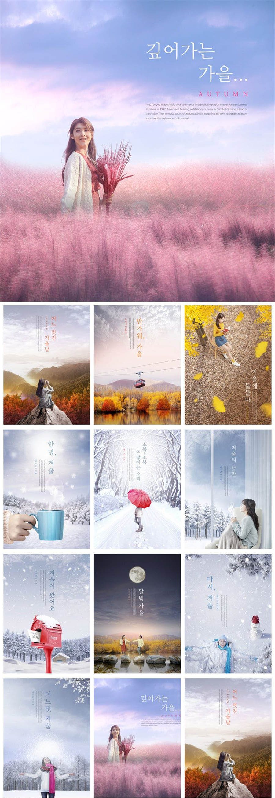 秋冬季风景色旅游自然风光雪景秋游创意元素海报模板素材PSD设计