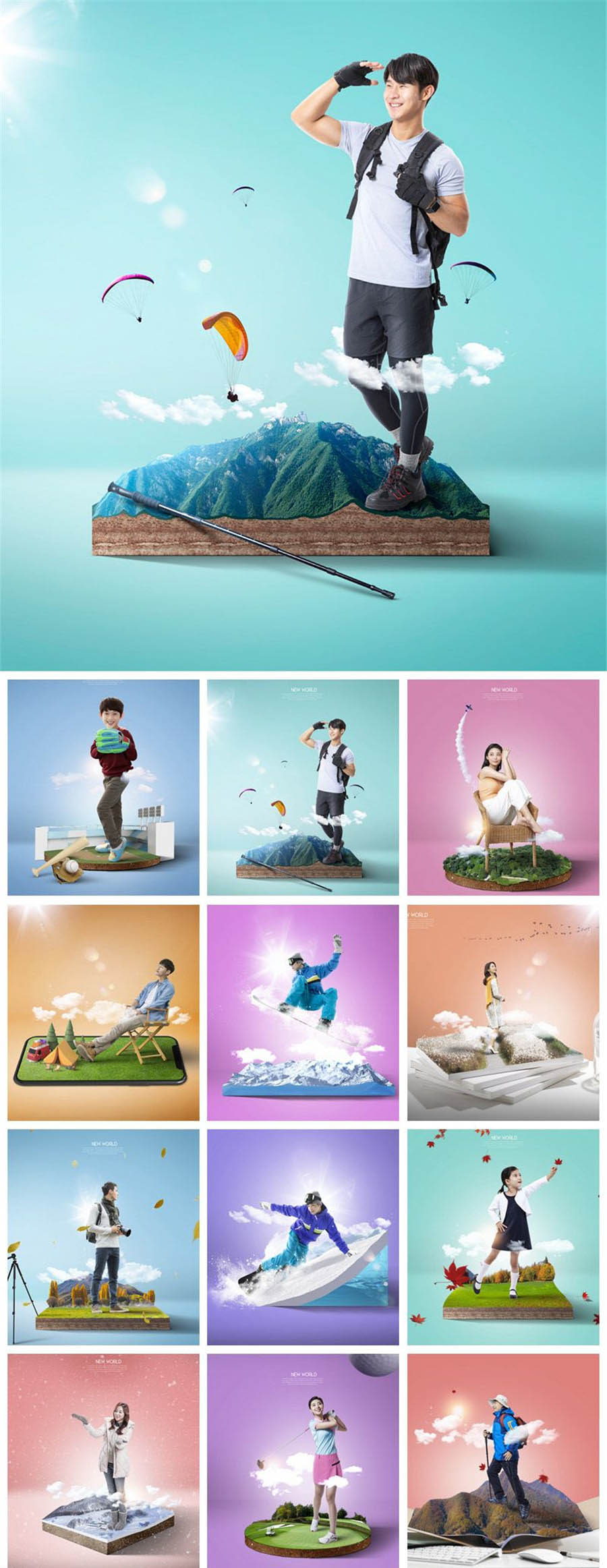 旅游旅行登山滑雪露营踏青立体场景创意元素PSD海报模板素材设计