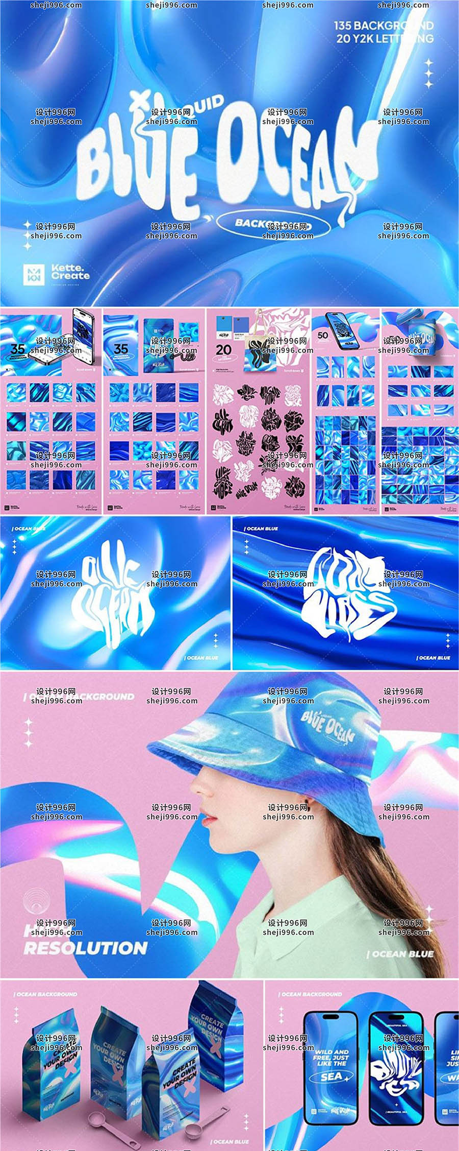 一套时尚潮流蓝色波浪液态流体背景JPG格式