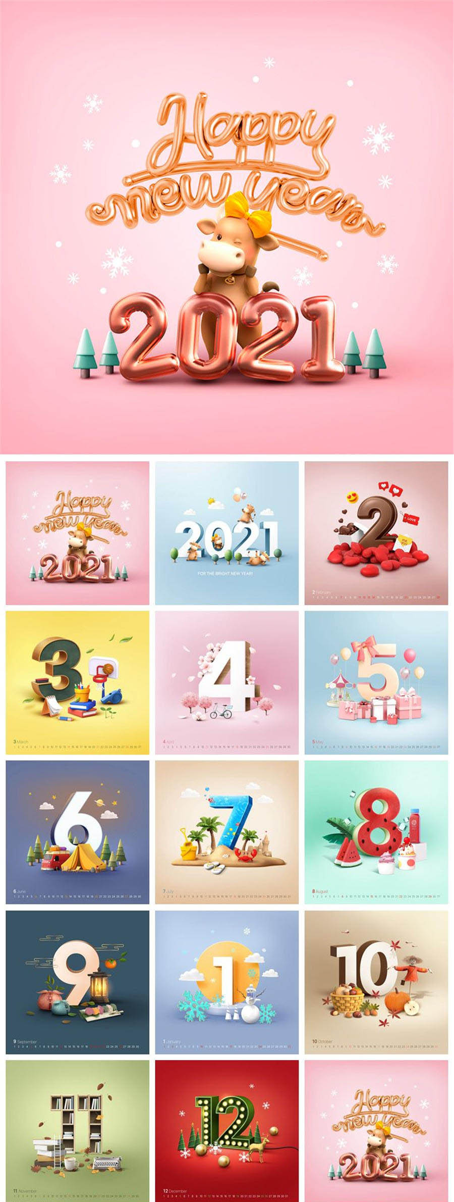 新年过年春节立体数字牛年旅游礼物创意元素海报模板PSD素材设计
