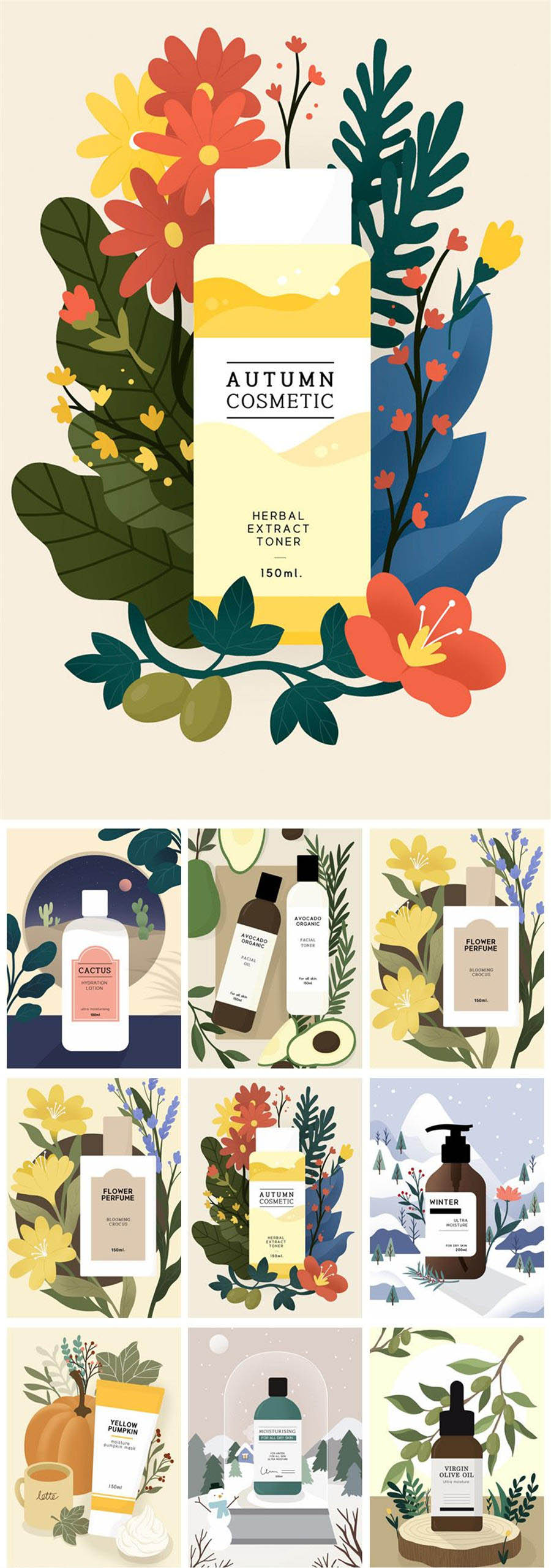 8款化妆品保养品护肤品手绘插画PSD素材