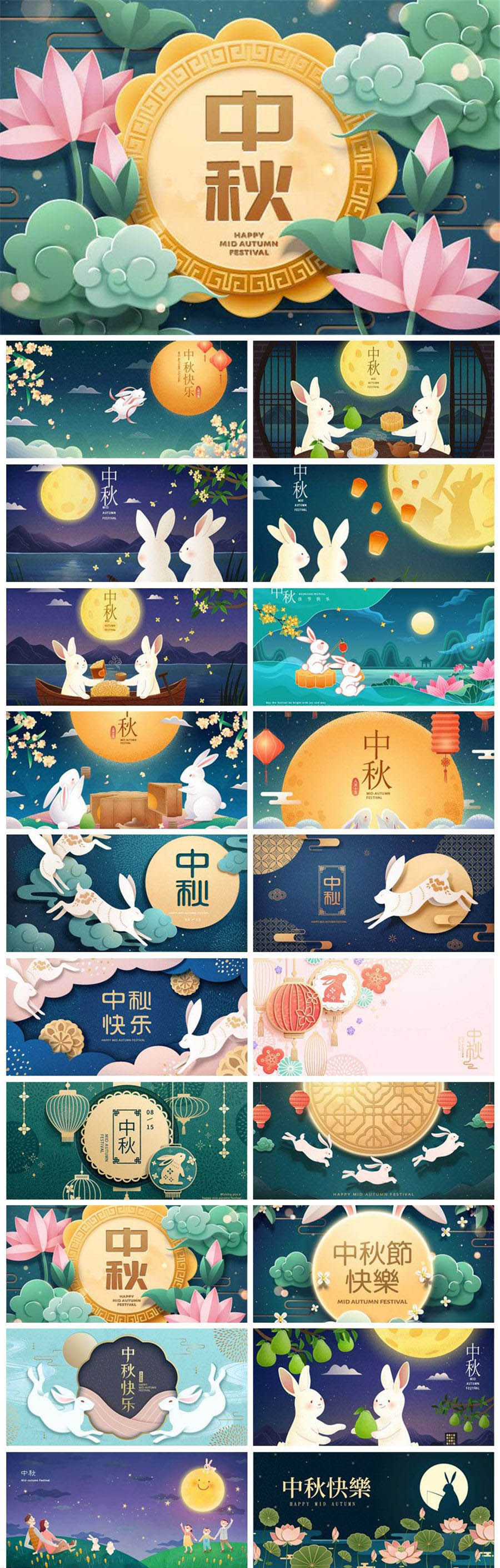 中秋节月亮兔子夜色秋夕月饼插图插画创意元素海报模板AI素材设计