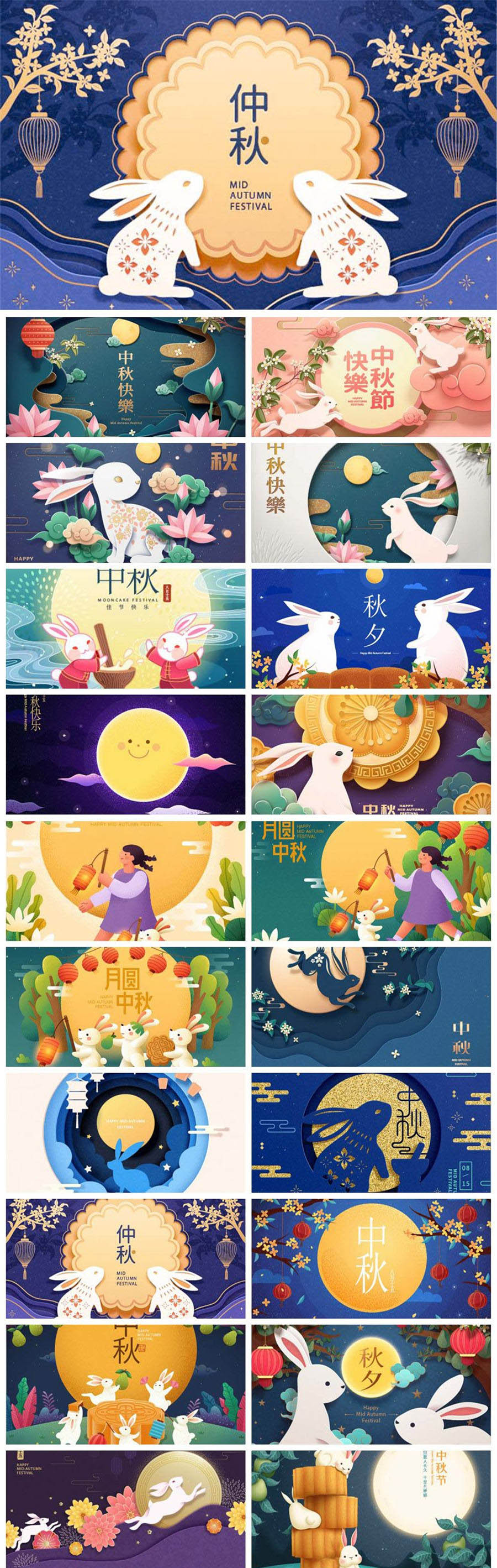 中秋节剪纸风月亮月饼月兔插画插图创意元素海报模板素材AI设计