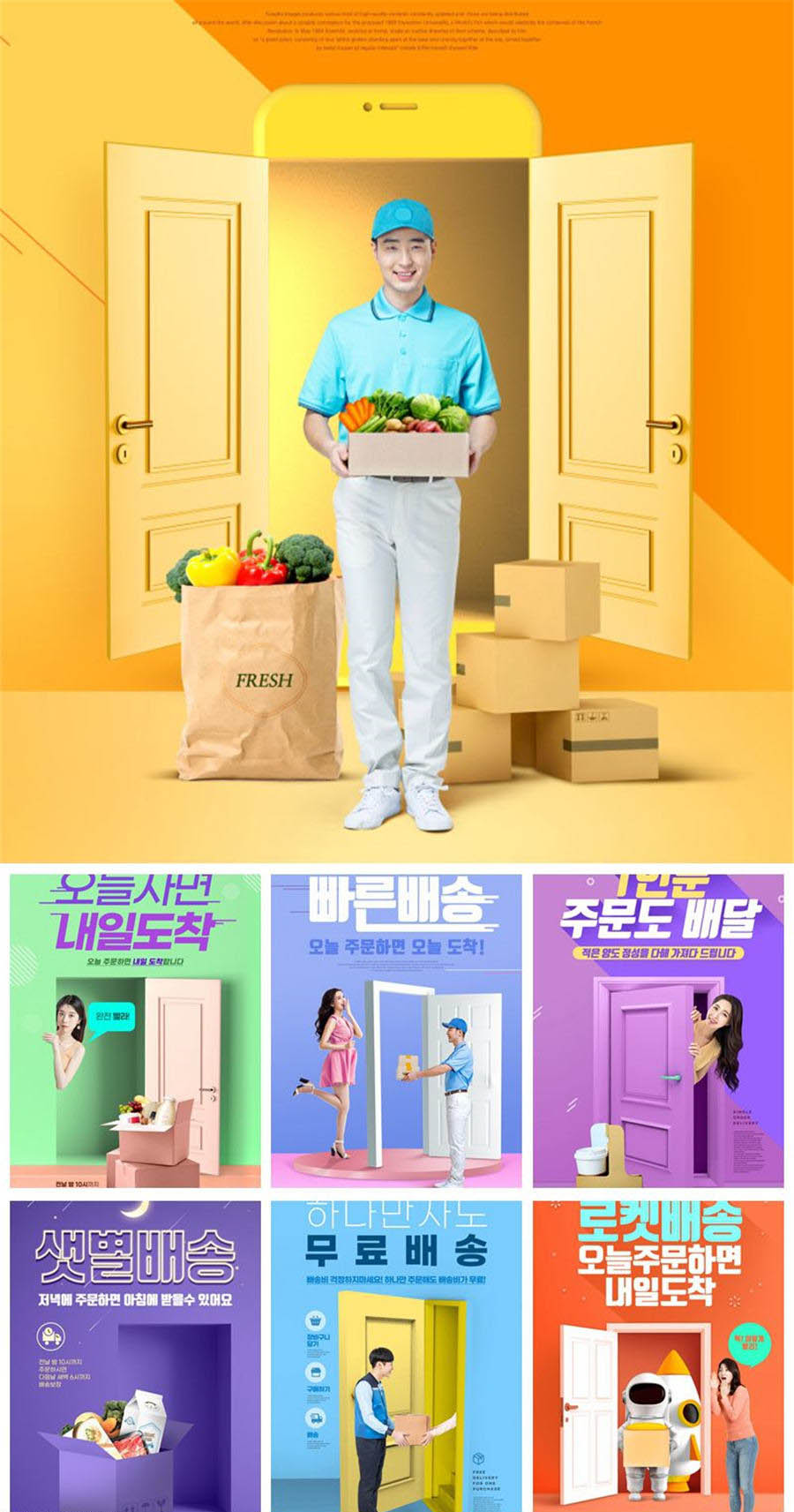 物流快递配送外卖跑腿生鲜送货上门创意元素海报模板PSD素材设计