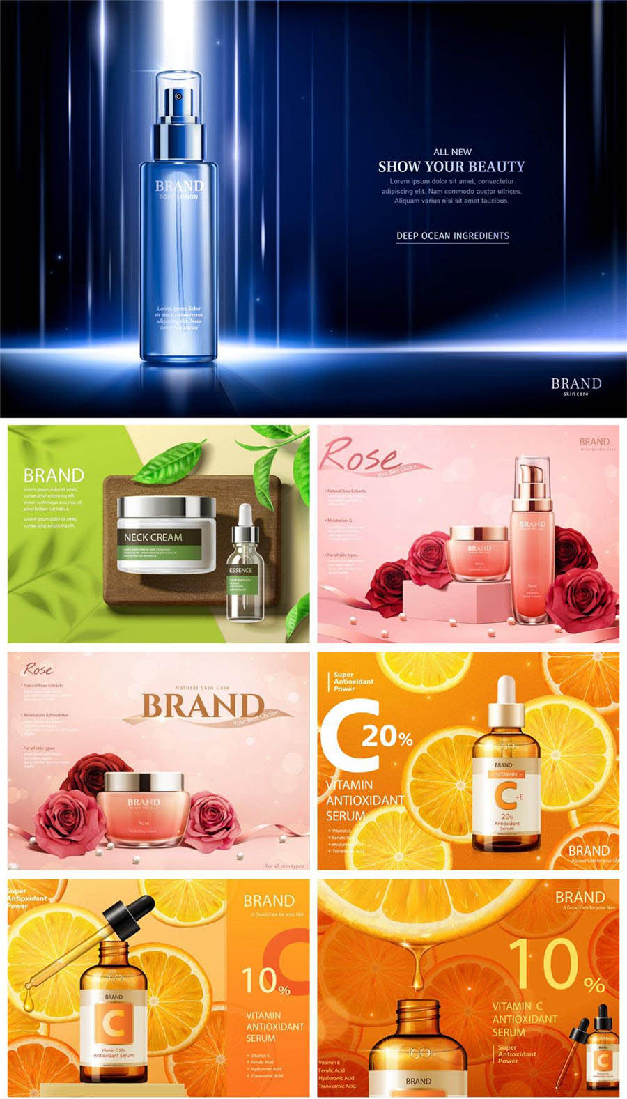 化妆护肤保养品植物玫瑰橙子水果精华创意元素AI海报模板素材设计