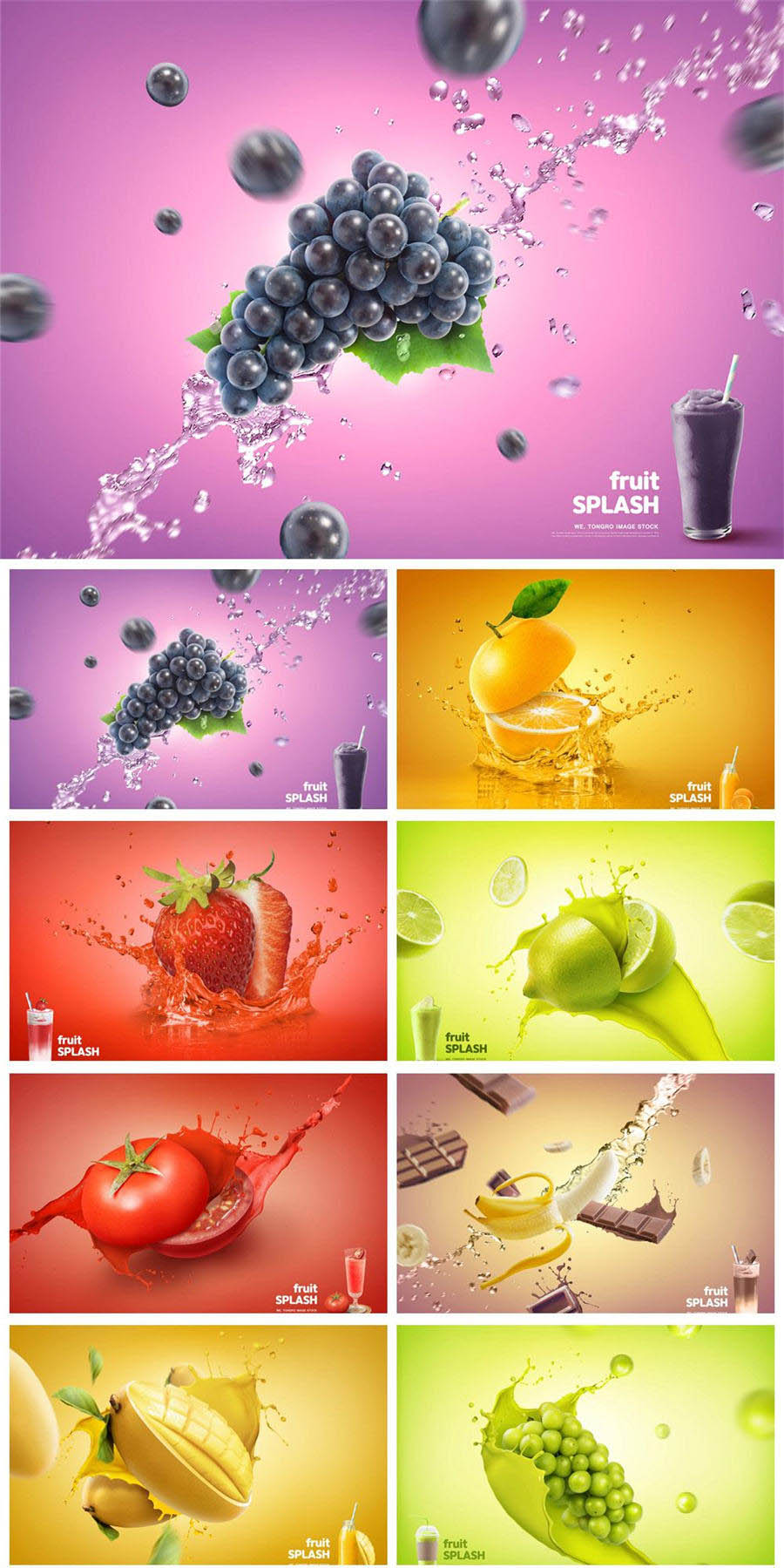 动感水花水果饮料果汁葡萄草莓芒果创意元素PSD海报模板素材设计