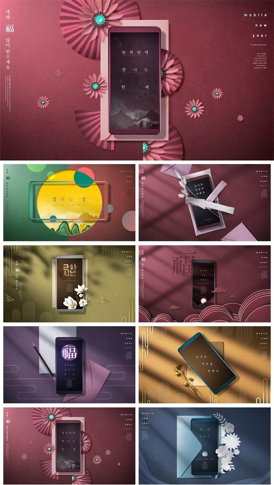 中式山水花朵鲜花新年祥云中国风手机创意元素海报模板素材PSD设计